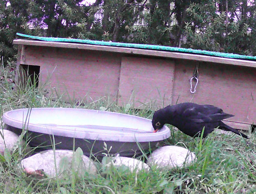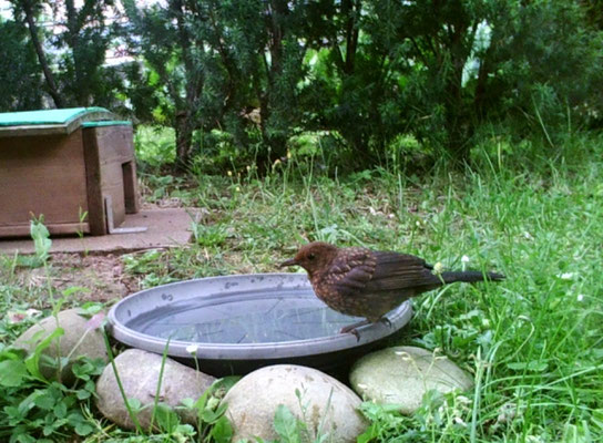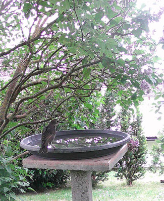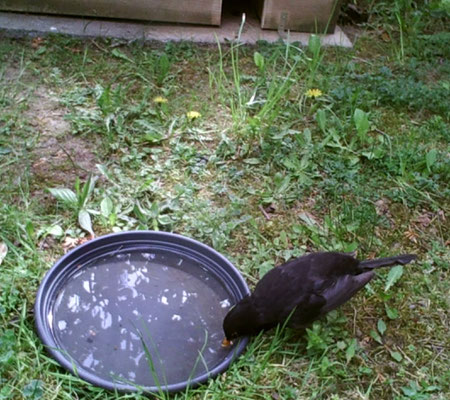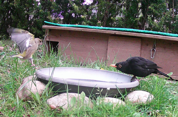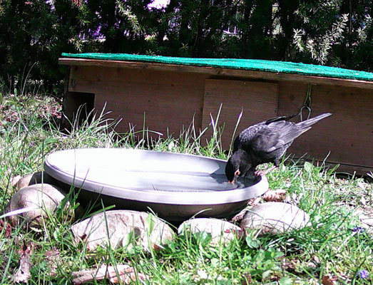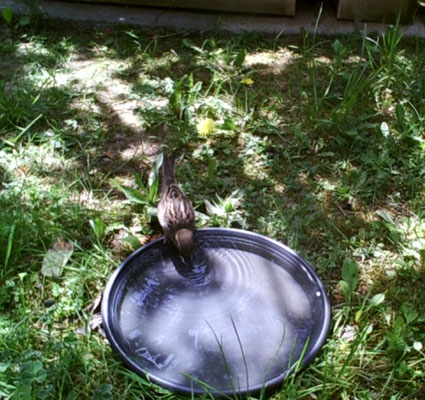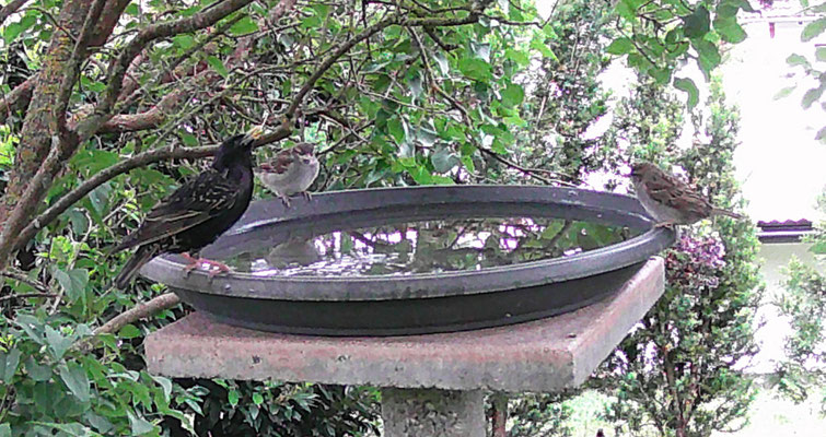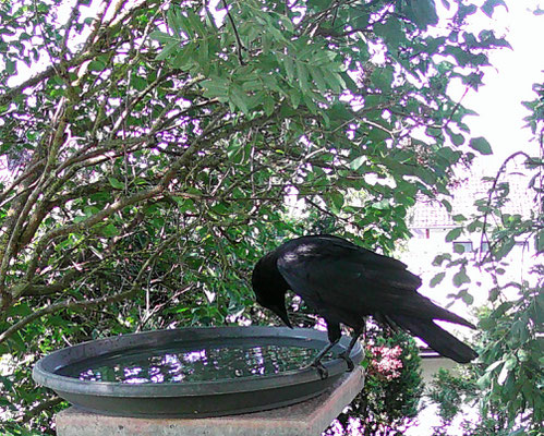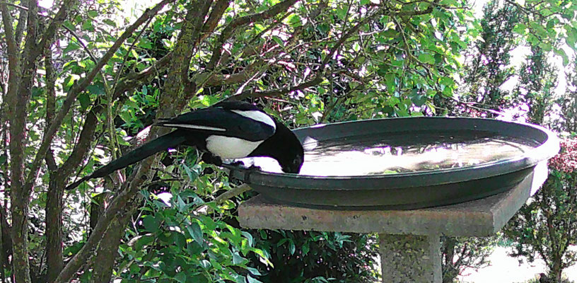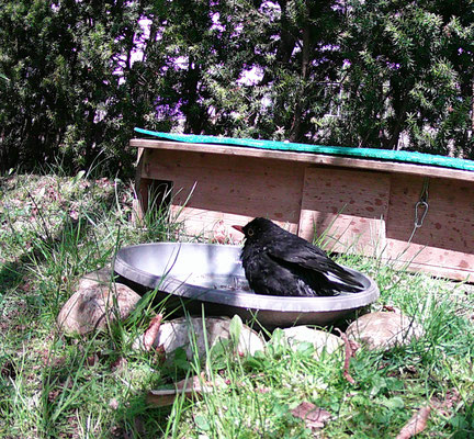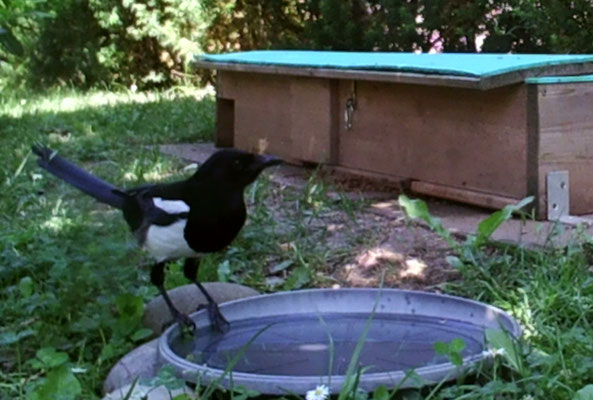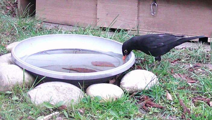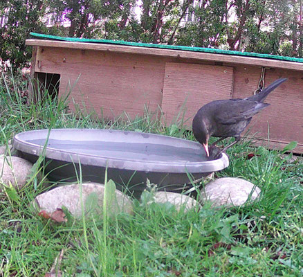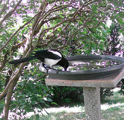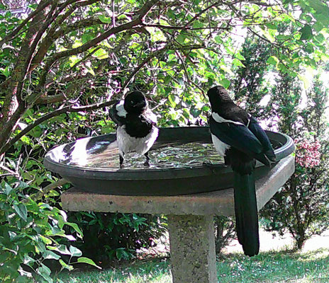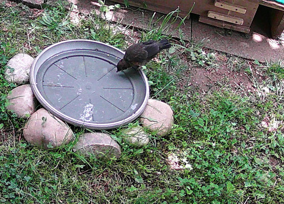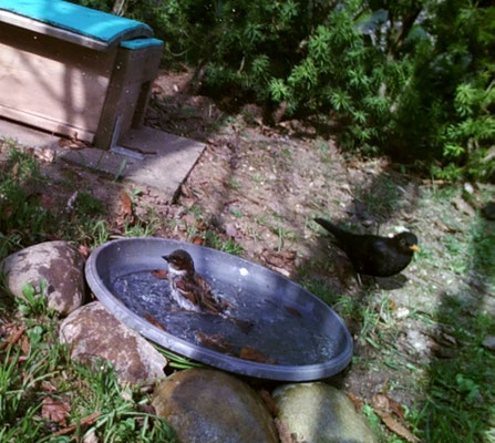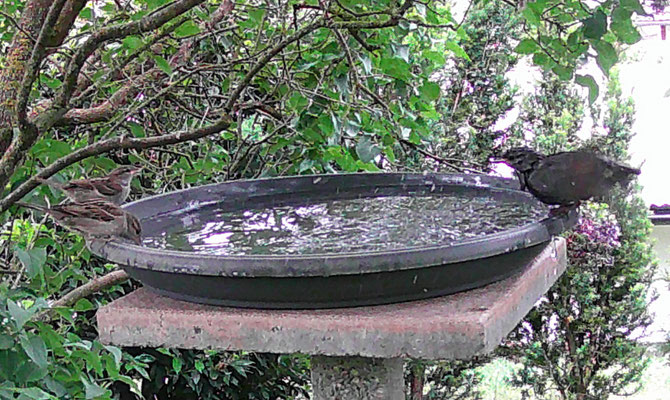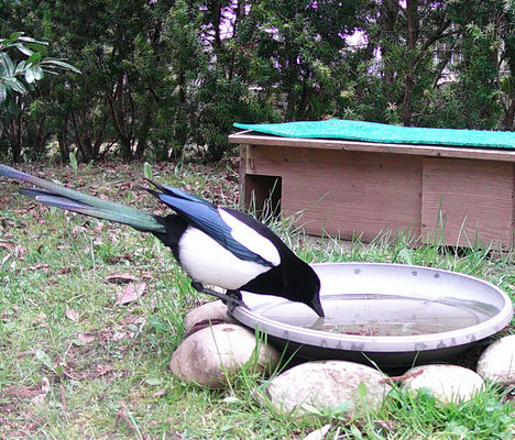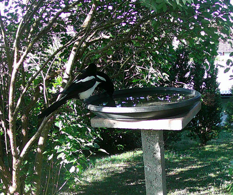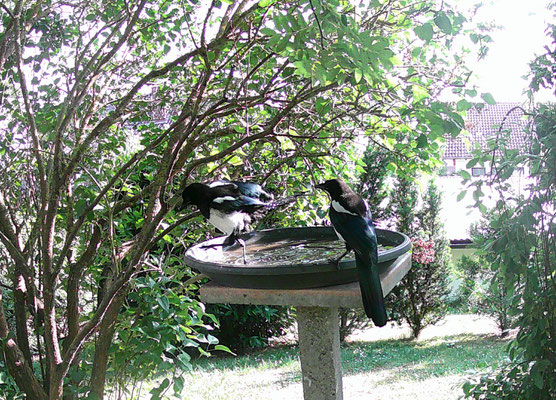 (Grundsätzlich müsste man auch den Hinweis auf Raubtiere geben, doch gerade bei ebenerdig stehenden Wasserschalen ist es sehr schwierig, diese wirklich sicher zu platzieren. Die meisten Vögel scheinen sich aber der Gefahr bewusst zu sein. Beispielsweise schlagen Amseln sofort lautstark Alarm, wenn sich eine Katze nähert. Auch bei Elstern konnten wir dieses Verhalten beobachten.)
