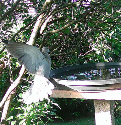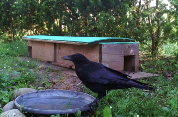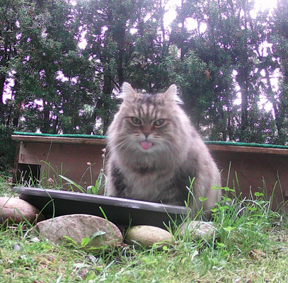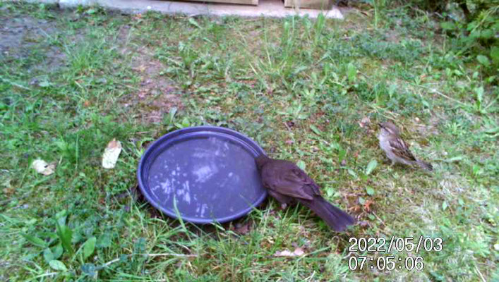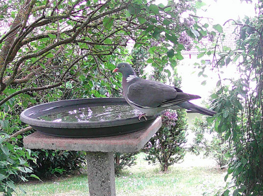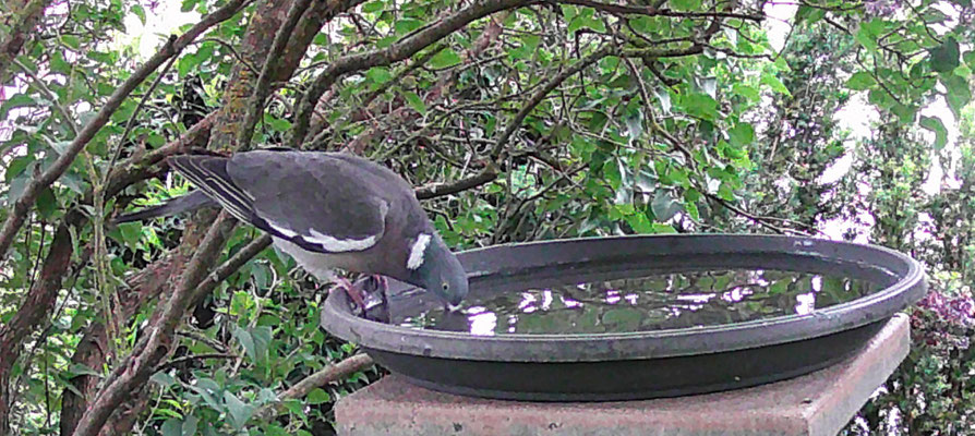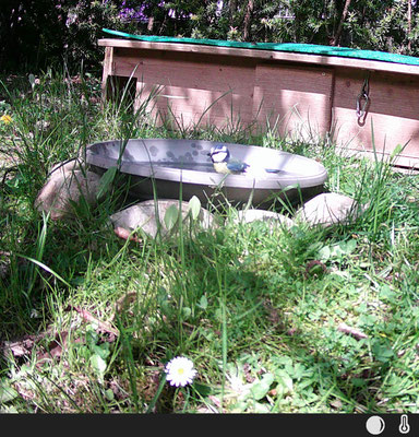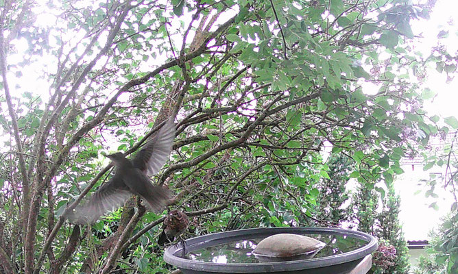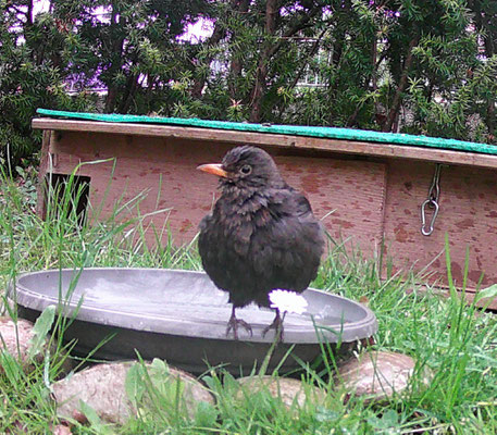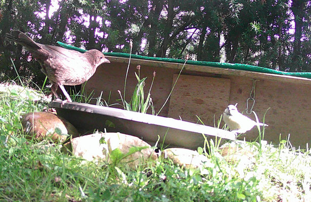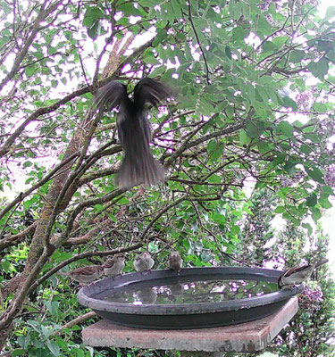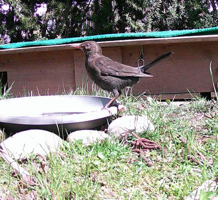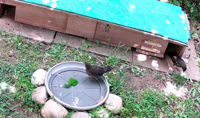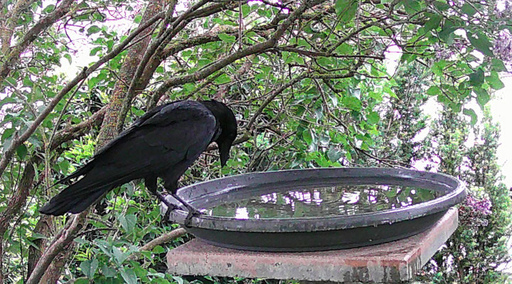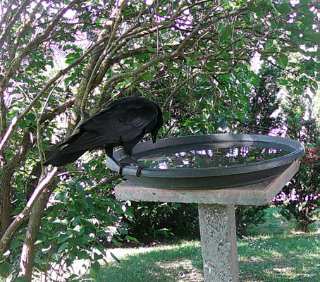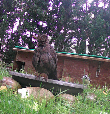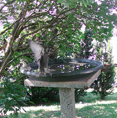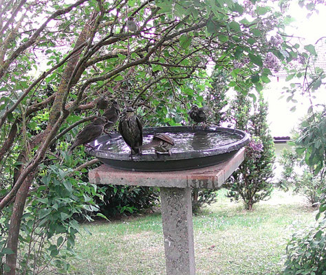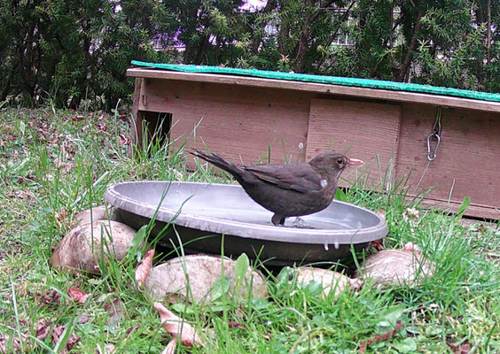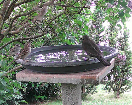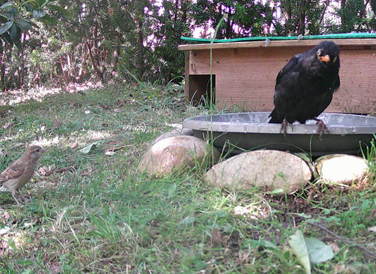 (Grundsätzlich müsste man auch den Hinweis auf Raubtiere geben, doch gerade bei ebenerdig stehenden Wasserschalen ist es sehr schwierig, diese wirklich sicher zu platzieren. Die meisten Vögel scheinen sich aber der Gefahr bewusst zu sein. Beispielsweise schlagen Amseln sofort lautstark Alarm, wenn sich eine Katze nähert. Auch bei Elstern konnten wir dieses Verhalten beobachten.)