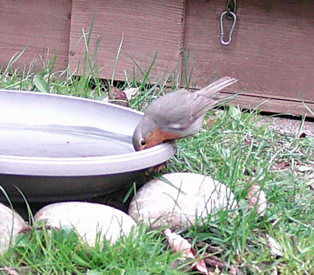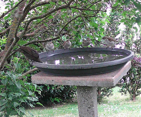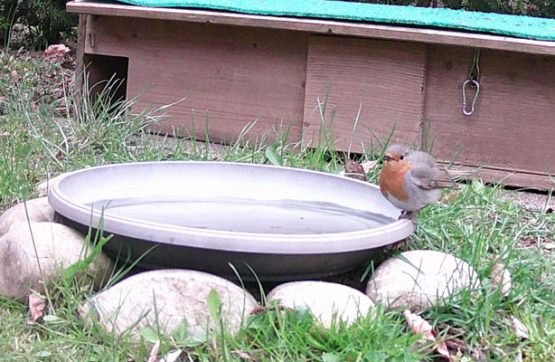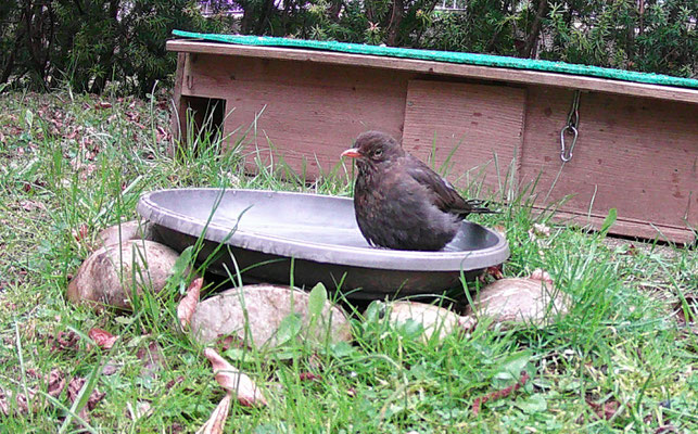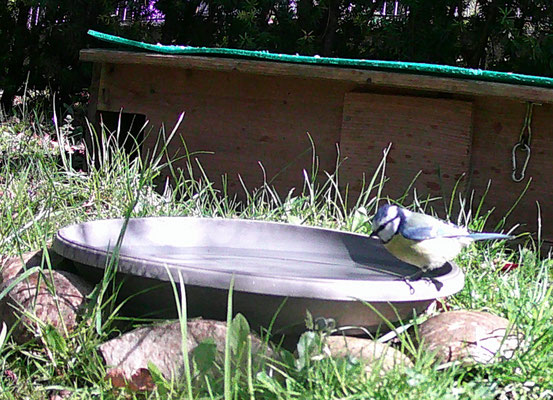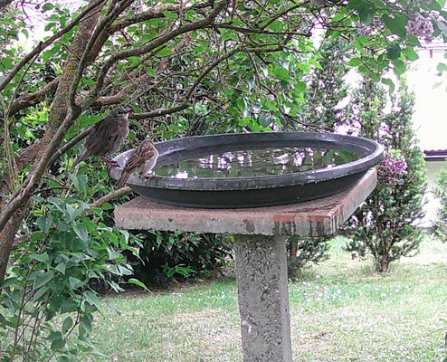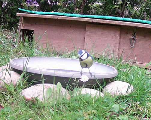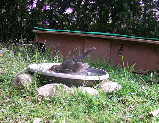Ein großer Blumenuntersetzer, in dem Vögel wie Amseln, Elstern, Spechte oder Wildtauben gern auch baden (auch Körperpflege trägt zum Wohlbefinden und zur Gesunderhaltung bei), ist für sehr kleine Vögel wie Meisen, Rotkehlchen oder Zaunkönige eher ungeeignet. Die Gefahr des Ertrinkens ist sogar gegeben. (Scheinbar erkennen diese Vögel meist das Problem, denn sie sind vorzugsweise an unseren Igeltrinkstellen zu sehen.)